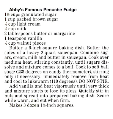 Ingredients for Peanut Butter Fudge: Evaporated Milk, Sugar, Brown Sugar, Butter, Marshmallo Fluff, Peanut Butter, Pecans or Walnuts & Vanilla.